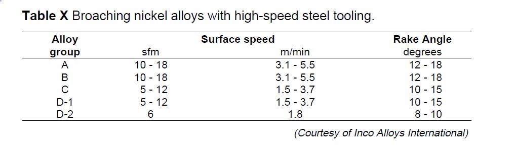 The cutting tool material choice must be consistent with the machining operation, the specific nickel alloy and its metallurgical condition (annealed or precipitation hardened). As a result of the high strength and work hardening characteristics of Nickel Alloys, small drills, taps, reamers and grooving tools or operations including uninterrupted cuts usually required high speed tools. However, these tools MUST be run at quite low speeds. When the machining operation allows for larger tools, carbide tipped tooling provides a good first choice for turning, some milling & turning operations. The selection of a reasonably strong carbide tool used in conjunction with a positive rake angle will usually give good results in turning.