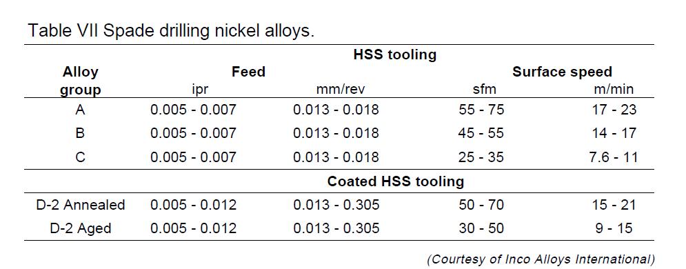 Depending on the hole diameter and depth, crankshaft, spade and gun drills are all options for deep hole drilling Nickel Alloys. Because of high strength and work hardening, the need to provide positive feed is extremely important.